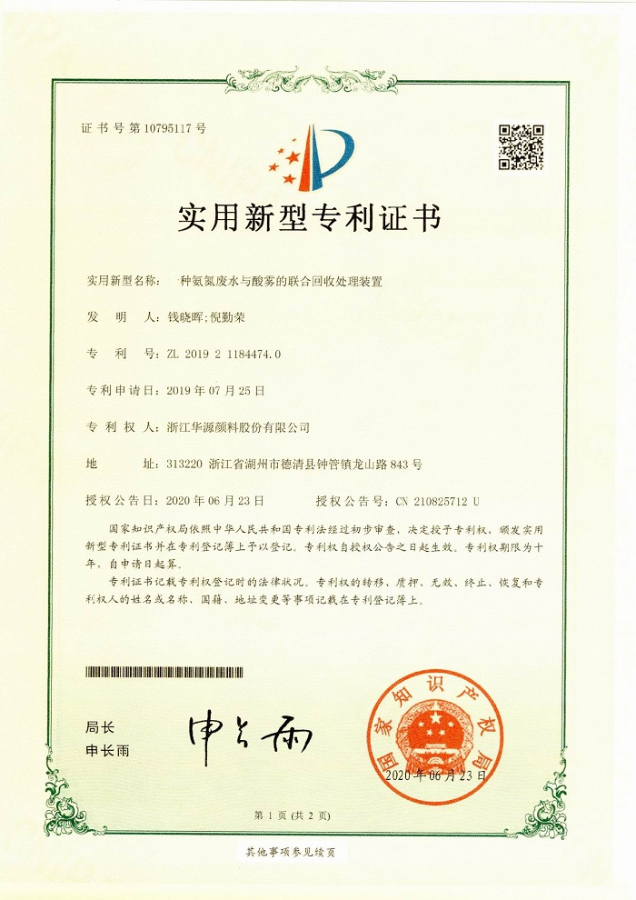 近日,升華集團所屬企業華源顏料6項實用新型專利獲國家知識產權局授權。這6項專利分別是:《一種氨氮廢水與酸霧的聯合回收處理裝置》、《一種工廠雨水收集利用裝置》、《一種低壓蒸汽與廢酸氣聯合回收裝置》、《一種投料倉》、《一種振動給料器》、《一種氮氧化物廢氣與酸霧聯合回收裝置》。