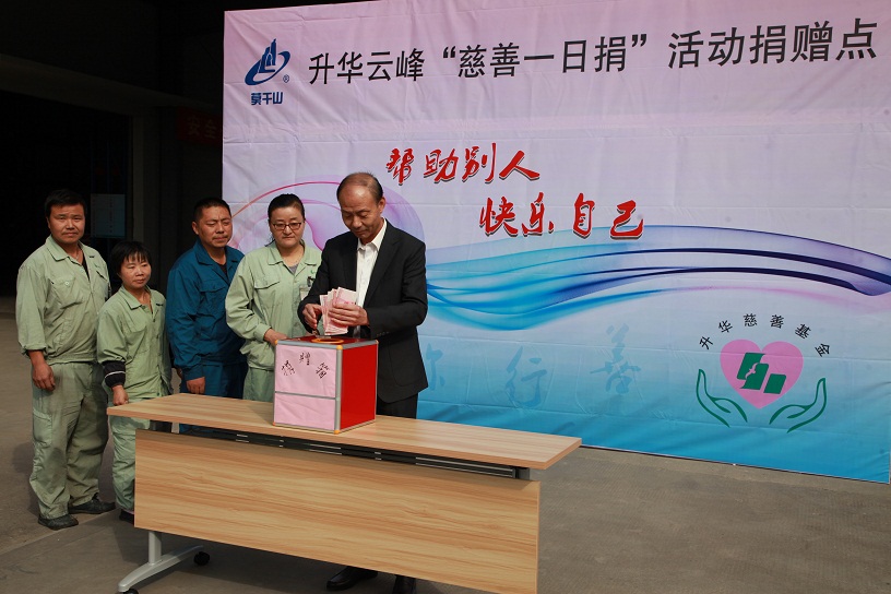 10月12日上午9時許,主題為“幫助別人,快樂自己”的第十四屆升華集團“慈善一日捐”活動率先在升華集團所屬企業云峰新材、華源顏料兩家兄弟企業舉行。兩家子公司各級管理人員帶頭,一線員工積極參與,慷慨解囊,奉獻愛心?! 按壬埔蝗站琛币殉蔀樯A慈善惠民、弘揚感…