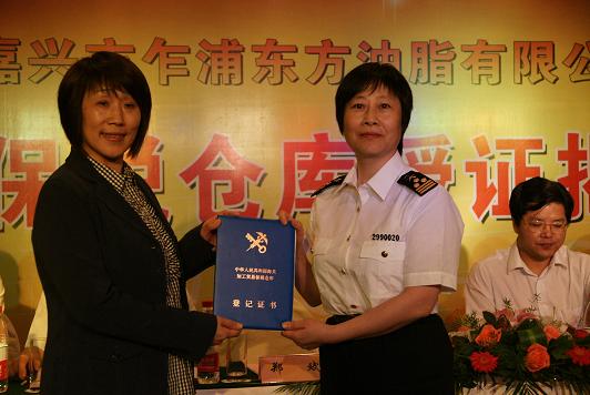 9月29日,浙江輕紡所屬企業嘉興市乍浦東方油脂有限公司彩旗招展,花團錦蔟,由中國海關批準設立的浙江省首個動植物油脂公用型保稅倉庫正式在這里掛牌。杭州海關、嘉興海關、嘉興港區等有關部門領導,集團公司董事長夏士林,浙江輕紡董事長兼東方油脂公司董事長郭蘊華等參加了授證、揭牌儀式。