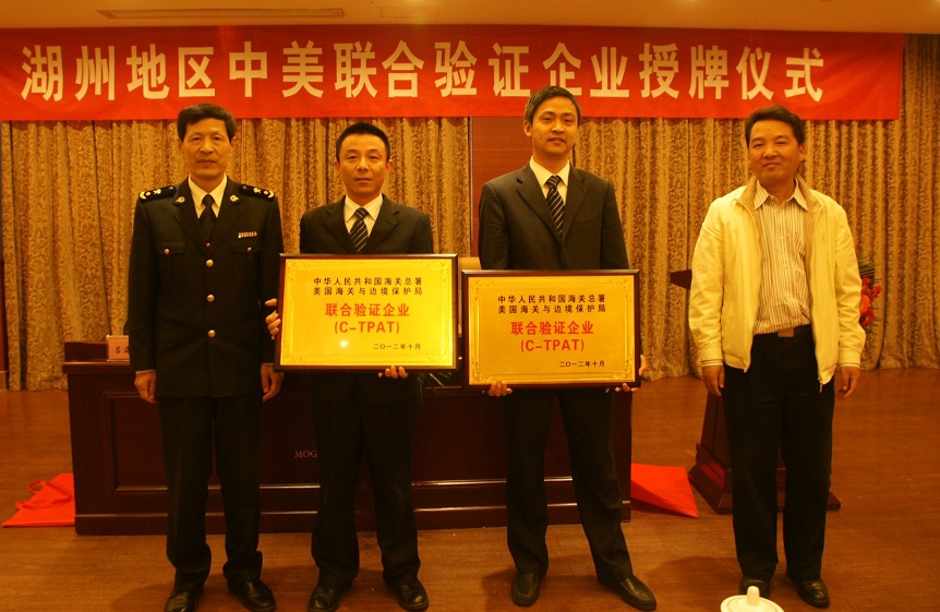 符合要求的企業不出國門,就能獲得企業輸美貨物在美國通關時的便利措施。11月12日下午,湖州地區中美聯合驗證企業授牌儀式在我縣莫干山大酒店舉行,云峰新材兩骨干子公司浙江升華云峰進出口有限公司、德清縣升強木業有限公司獲得由國家海關總署、美國海關與邊境保護局共同簽發的C-TPAT聯合驗證證書。湖州海關關長殷杭俊、德清縣副縣長王少華出席授牌儀式,云峰新材總經理沈衛文在授牌儀式上發言。