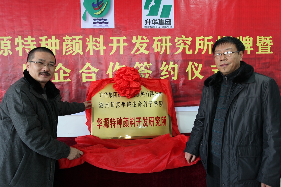 市經(jīng)信委、市科技局有關(guān)部門負(fù)責(zé)人,湖州師范學(xué)院生命科學(xué)學(xué)院院長(zhǎng)李彬、黨委書記錢學(xué)芳、副院長(zhǎng)曹楓,華源顏料董事長(zhǎng)兼總經(jīng)理竺增林、副總經(jīng)理馮阿榮等參加了揭牌暨簽約儀式。