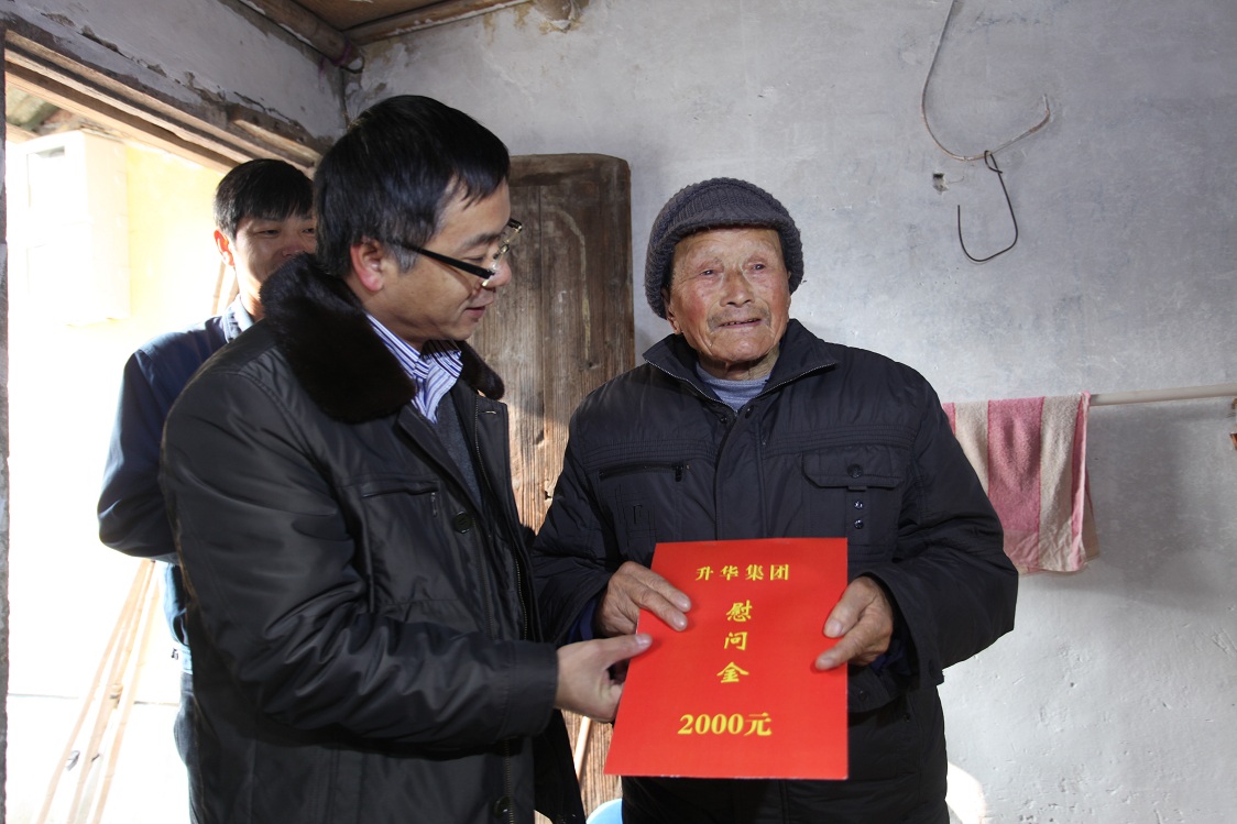 “大伯,這是我們升華集團的一點心意,快過年了,我們來看看您。”在鐘管村付介一組,集團公司副總經理沈德堂一進門就拉著85歲高齡的傅阿狗大伯親切地噓寒問暖。老人家孤單一人,平時依靠侄兒照顧。盡管年事已高,傅阿狗老人還經常村里的老年活動室幫忙。