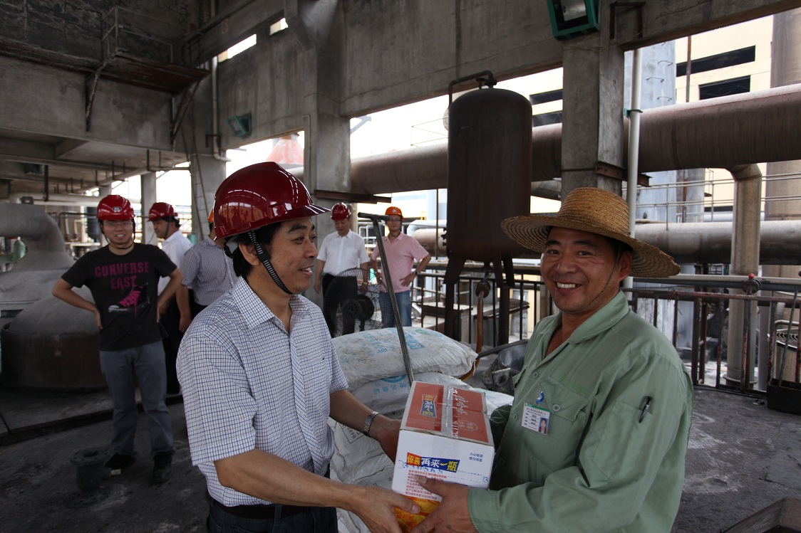 7月26日下午2點整,正值當天的高溫時段,集團所屬企業升華拜克董事長兼總經理張文駿、副總經理吳松根等帶隊到本部各分廠慰問堅守在生產一線的廣大員工,為他們送去了解暑的飲料(見圖④)。