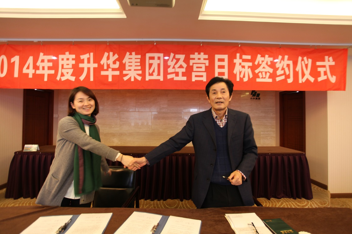 1月18日,升華集團2014年及新三年經營目標簽約儀式在升華大酒店舉行,集團公司董事長夏士林分別與集團所屬一級子公司董事長和集團公司資金管理部門負責人在協議書上簽字。集團公司總裁吳夢根就考核指標設置等作了解釋性說明。此項協議的簽署,預示著升華新一輪發展大幕已經開啟。
