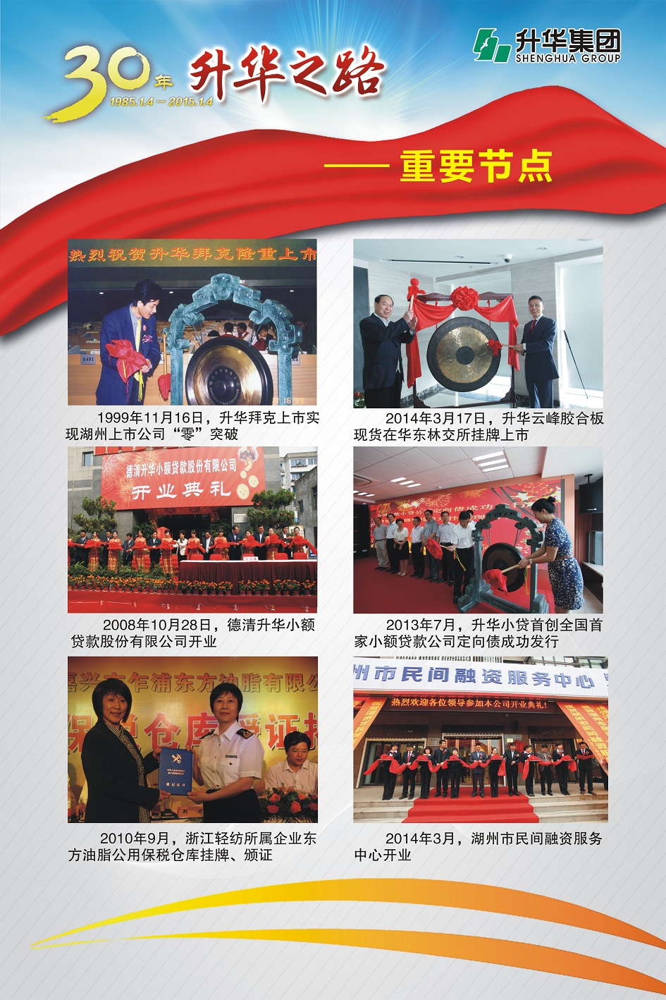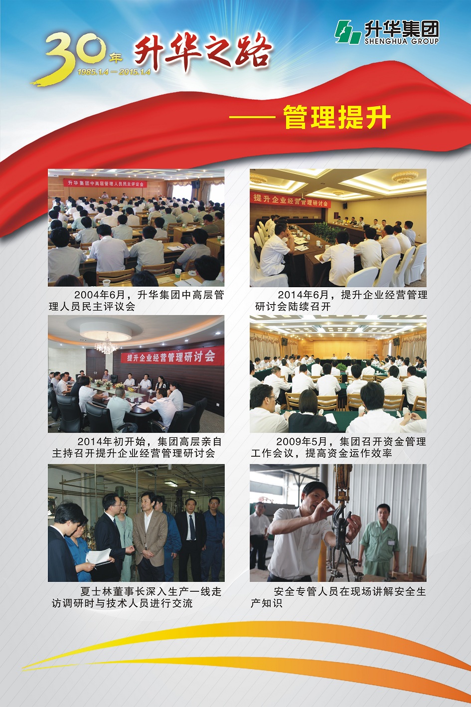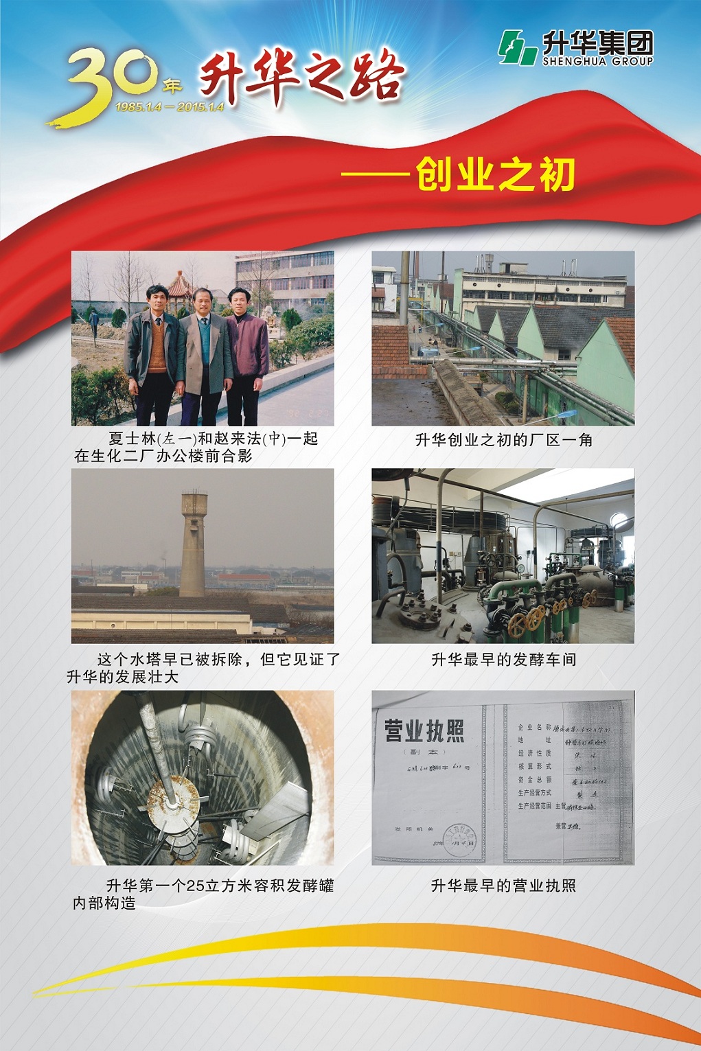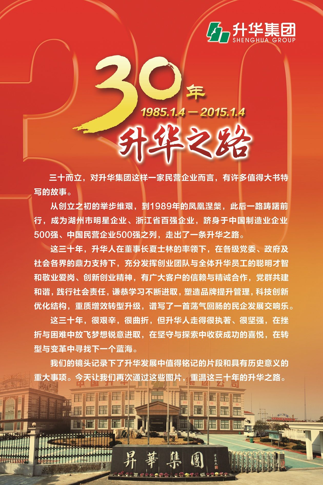 升華集團即將迎來創立30周年。30年,半個甲子,在風和日麗與驚濤駭浪中,升華艦隊揚帆遠航,經受風雨的洗禮,也收獲成功的喜悅。為了喜迎升華創立30周年,回眸升華走過的不同尋常的征程,本報特意收集了“30年升華之路”系列圖片,陸續在集團所屬各子公司巡回展出。圖片展的內容分為創業之初、領導關懷、重要節點、黨群共建、管理提升、品牌升華、踐行責任、謙恭之行、轉型升級、榮耀升華等章節。
