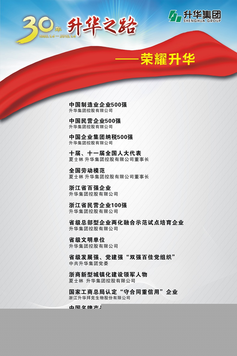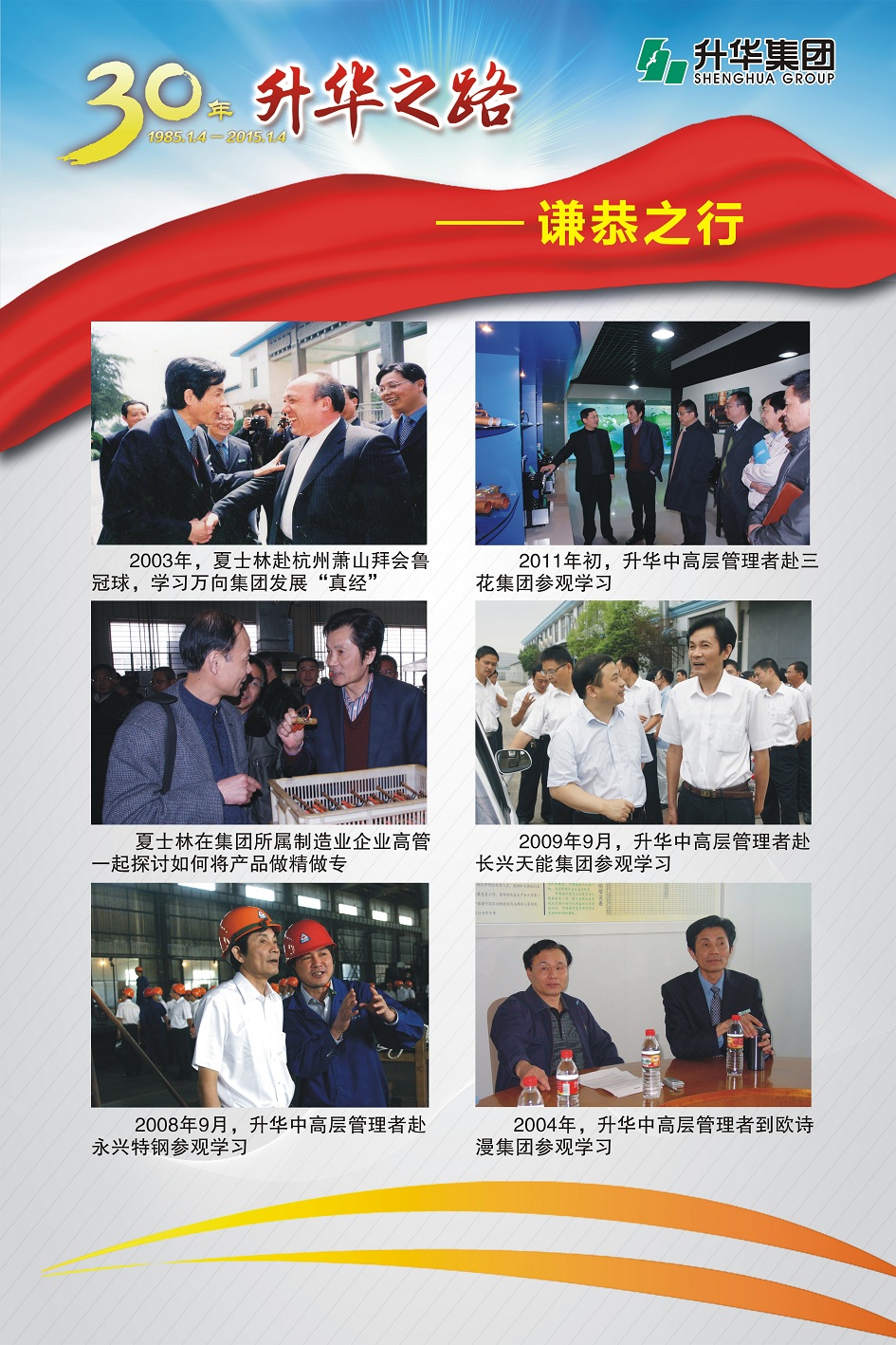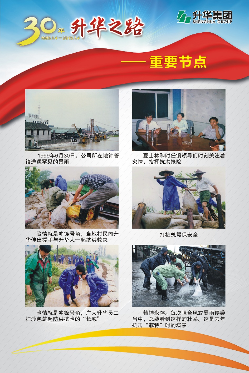 升華集團即將迎來創立30周年。30年,半個甲子,在風和日麗與驚濤駭浪中,升華艦隊揚帆遠航,經受風雨的洗禮,也收獲成功的喜悅。為了喜迎升華創立30周年,回眸升華走過的不同尋常的征程,本報特意收集了“30年升華之路”系列圖片,陸續在集團所屬各子公司巡回展出。圖片展的內容分為創業之初、領導關懷、重要節點、黨群共建、管理提升、品牌升華、踐行責任、謙恭之行、轉型升級、榮耀升華等章節。