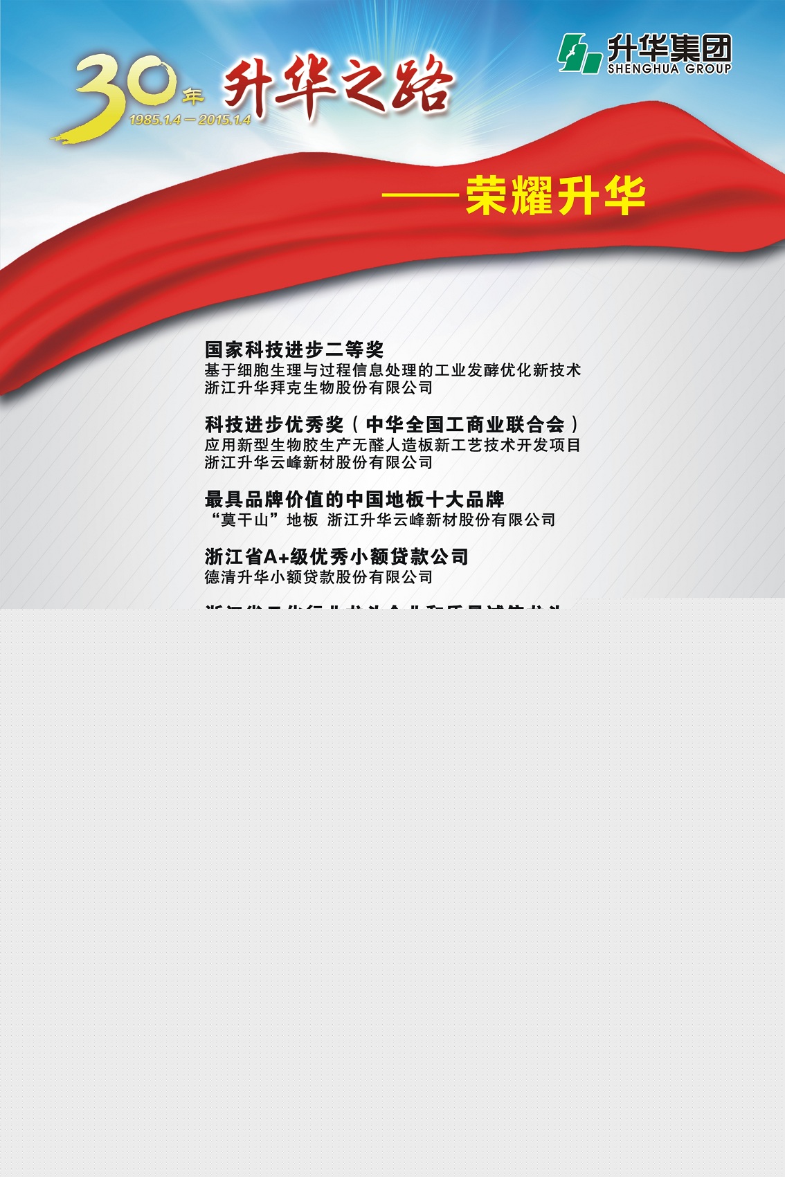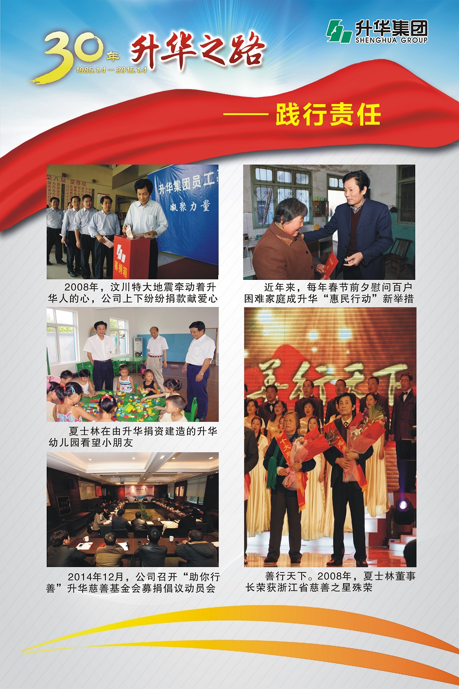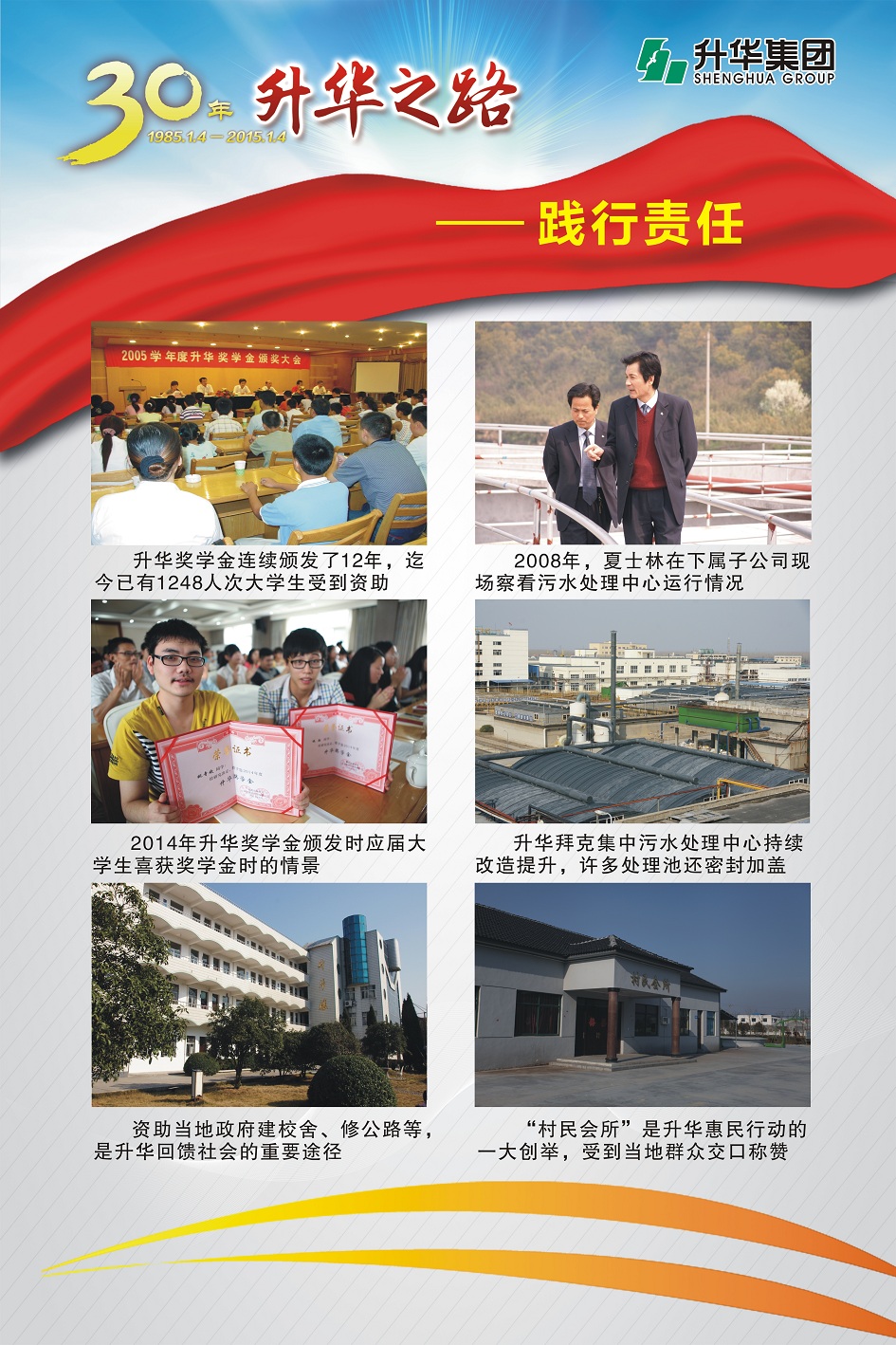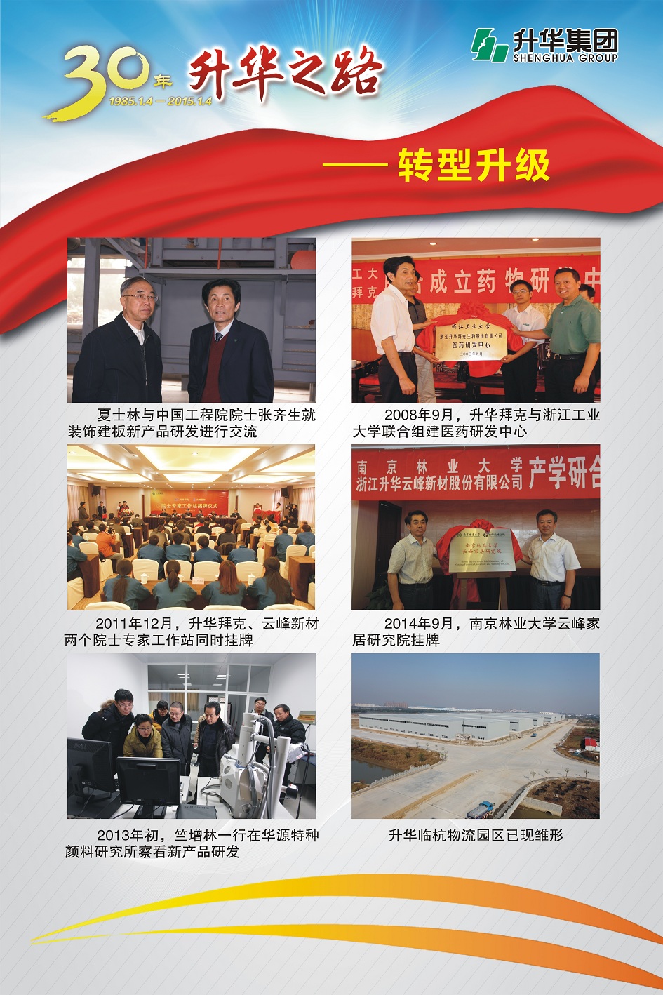 升華集團即將迎來創立30周年。30年,半個甲子,在風和日麗與驚濤駭浪中,升華艦隊揚帆遠航,經受風雨的洗禮,也收獲成功的喜悅。為了喜迎升華創立30周年,回眸升華走過的不同尋常的征程,本報特意收集了“30年升華之路”系列圖片,陸續在集團所屬各子公司巡回展出。圖片展的內容分為創業之初、領導關懷、重要節點、黨群共建、管理提升、品牌升華、踐行責任、謙恭之行、轉型升級、榮耀升華等章節。