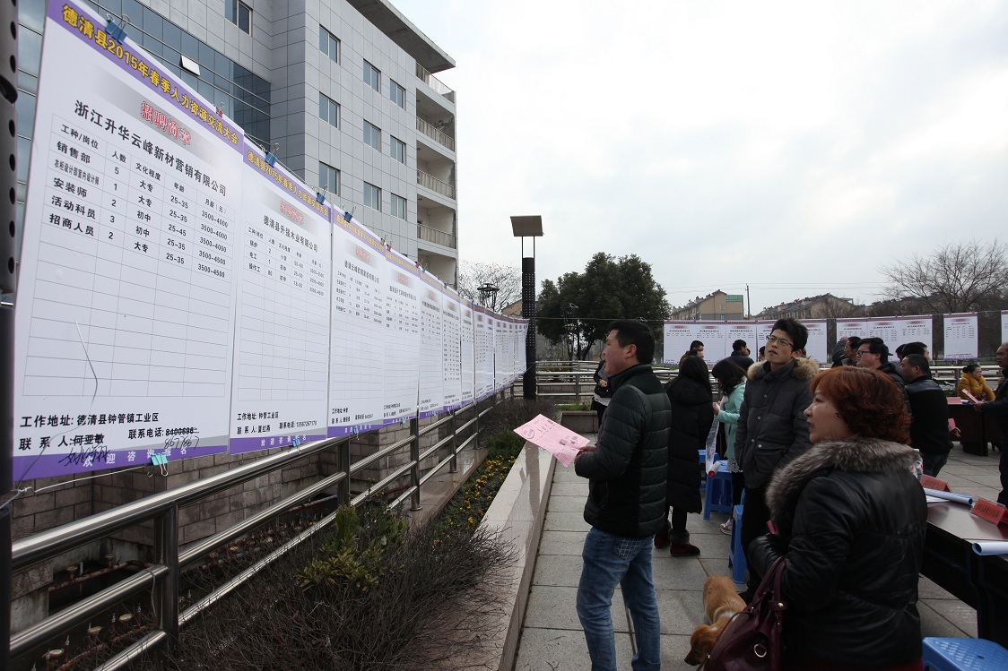 春意濃,人亦早。3月1日,星期日,2015年德清縣春季人力資源交流大會如期舉行。上午9時許,鐘管鎮(zhèn)行政中心廣場上已聚集了不少從當(dāng)?shù)丶爸苓呧l(xiāng)鎮(zhèn)趕來的“找工族”,他們在這一年一度的春季人力資源交流大會上爭相尋找適合自己的工作崗位。集團(tuán)所屬企業(yè)升華拜克、云峰新材、華源顏料等均提供了數(shù)量不等的崗位,而云峰新材無疑是此次人力資源招聘大戶。