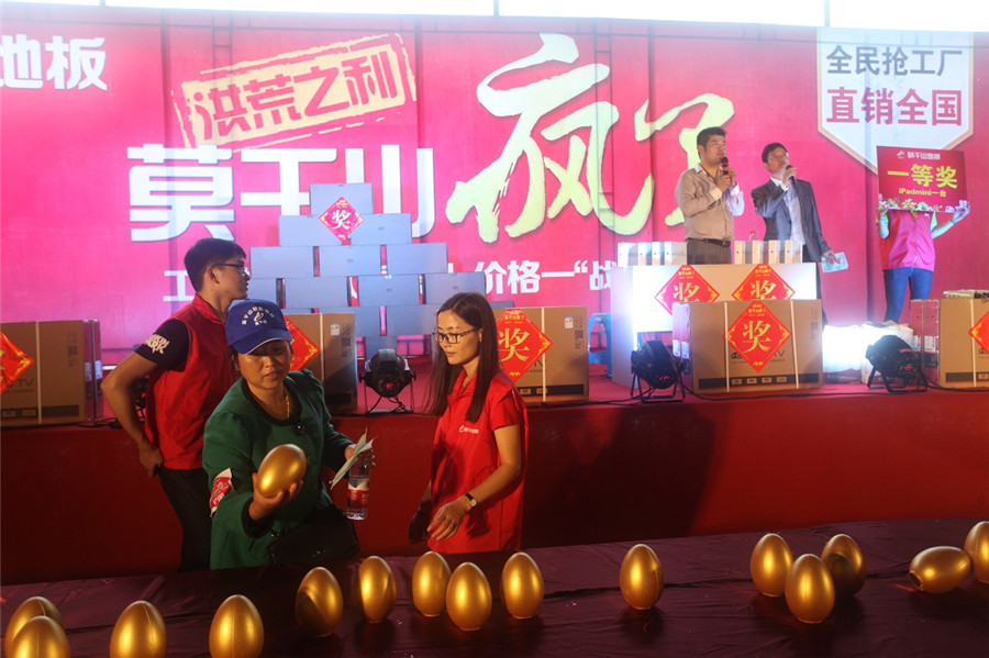 活動當天,來自江浙皖三省的客戶不僅搶購了自己心儀的莫干山地板,而且分享了現金、彩電、智能手機、實木椅子等品種各異的獎品,將幸運帶回家。