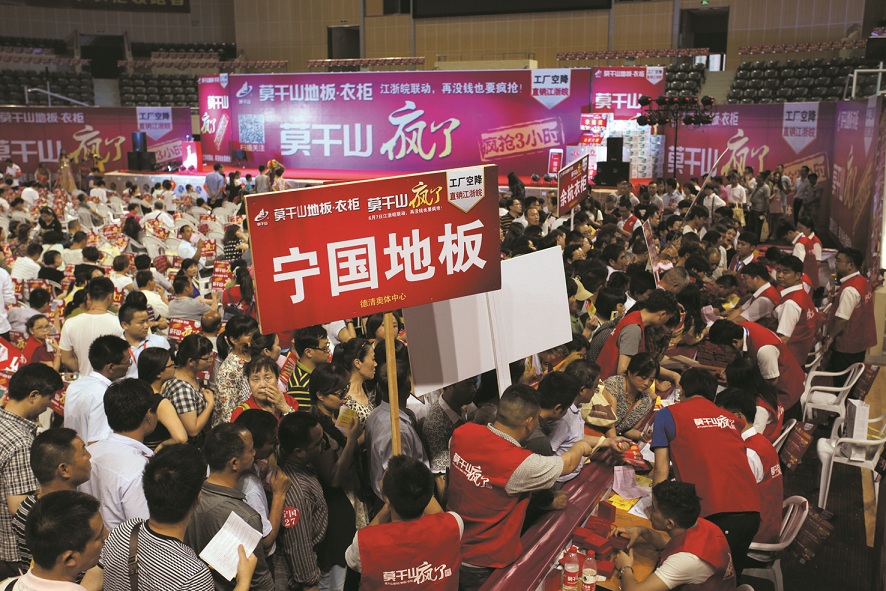 6月7日,德清縣體育中心籃球館內人聲鼎沸,“工廠空降 直銷江浙皖”,集團所屬企業云峰新材莫干山衣柜•地板江浙皖三省聯動在這里掀起搶購熱潮。上千名莫干山品牌忠實消費者從江蘇、安徽以及省內各地趕來,搶購自己心儀的莫干山品牌衣柜、地板產品。短短的3個小時成交1200多個訂單。火爆場面禁不住讓人驚呼:“莫干山瘋了!”